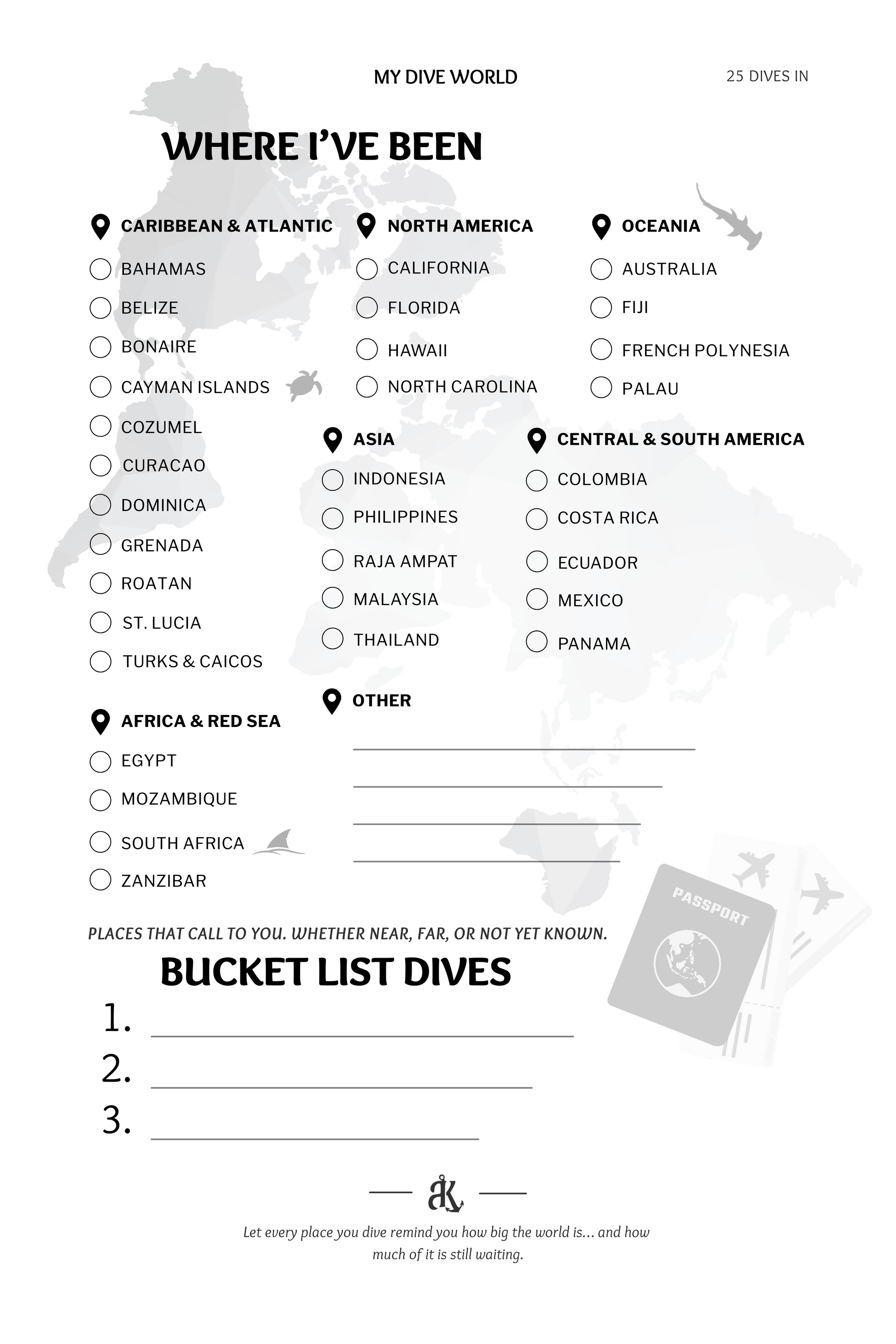You’ll also explore My Dive World—a global reflection spread to track where you’ve been, dream of where you’ll go, and reflect on the dive sites and milestones that shaped your underwater journey.
